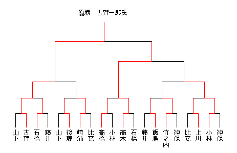 日に日に秋めいてきた今日この頃ですが、今回で数えること9回目を迎える「ザ・将棋OB・OG会」の例会が18日、東京・御茶ノ水「談話室Go」で開催されました。 今回の例会の参加者は、小林、飯島、後藤、藤井、竹之内、古賀、高木、崎浦、石橋、石曽根、神保、南條、上川、高橋、比嘉、山下(敬省略)と16名を数え、たくさんの方が参加されました。 今後もっと参加者そして会のメンバーが増えることを望みます。 今回のトーナメントは、上記参加者のうち遅れて参加の石曽根氏と南條氏を除く14名で、激戦が展開されました。 今回の特筆すべきところは、コバケンさんの活躍でしょうか。2回戦で上川女流初段を破った後、次の対戦相手がたけちゃんこと竹之内氏だと分かると、「どうせ負ける!」とつぶやいていたが、気がつくと金星(失礼)を上げて4回戦に進出していました。 最近コバケンさんは、なにやら24(将棋倶楽部24)で好調なようで、実はひそかに「負かしたろ.oO」と考えていたに違いない。(笑) そして今回の決勝戦は、優勝回数1回、準優勝回数3回を誇る高木氏と、優勝回数こそ1回であるが泣く子も黙る?アマ名人こと古賀一郎氏とのあいだで戦われました。